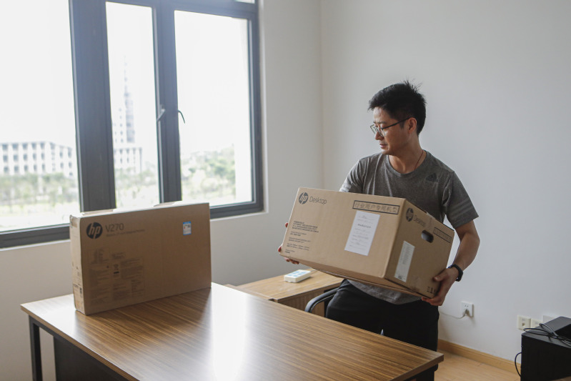 7月20日一早,多日阴雨终于暂停,晨雾在长山校区的湖面渐渐淡去,群楼显出靓丽的身姿。经管学院两校区协调组、各系部各科室、各房间真正做到全方位的点对点空间对接、保障对接。在搬迁现场,老师们在新老校区间切换,脸上都洋溢着憧憬新校区的幸福微笑,心底都留存着对老校区的不舍。搬迁组的老师来不及感受新校区食堂的就餐环境,手捧盒饭现场指挥协调。学院党政办主任王昕,在搬迁时,楼内步数超5万步,接打电话超200多次,他自己笑着说是“跑断腿,磨破嘴”。