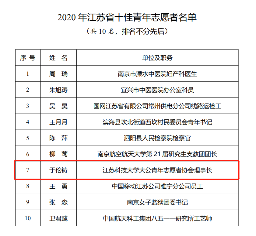 3月5日,2021年江苏省暨南京市青年志愿服务主题日活动在南京举行。本次活动由共青团江苏省委、江苏省文明办、江苏省民政厅、江苏省志愿者协会主办,共青团南京市委等单位承办。活动现场表彰了2020年度省十佳青年志愿者和十佳青年志愿服务项目团队等。我校材料科学与工程学院焊接技术与工程专业2017级本科生于伦铸获评“江苏省十佳青年志愿者”,是本届年龄最小的“十佳”获奖者。据悉,此次“十佳青年志愿者”评选分为初选推报、专家复评、候选答辩、综合评定等环节,我校于伦铸同学从全省264名“优秀青年志愿者”中脱颖而出,经过二十强候选答辩后,最终成功当选“十佳”。