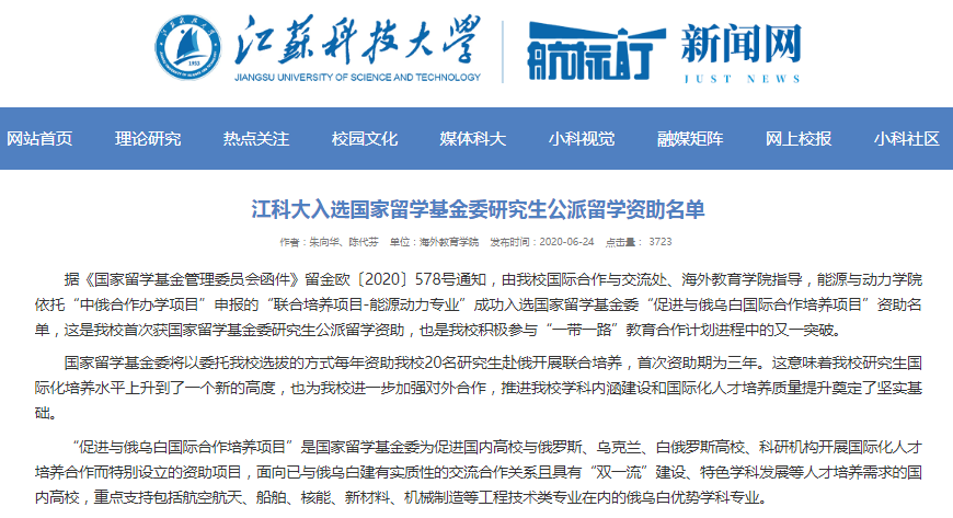 2020年“联合培养项目-能源动力专业”成功入选国家留学基金委研究生公派留学资助名单,国家留学基金委以委托我校选拔推荐的方式每年资助我校20名研究生赴俄开展研究生联合培养,首次资助期三年。