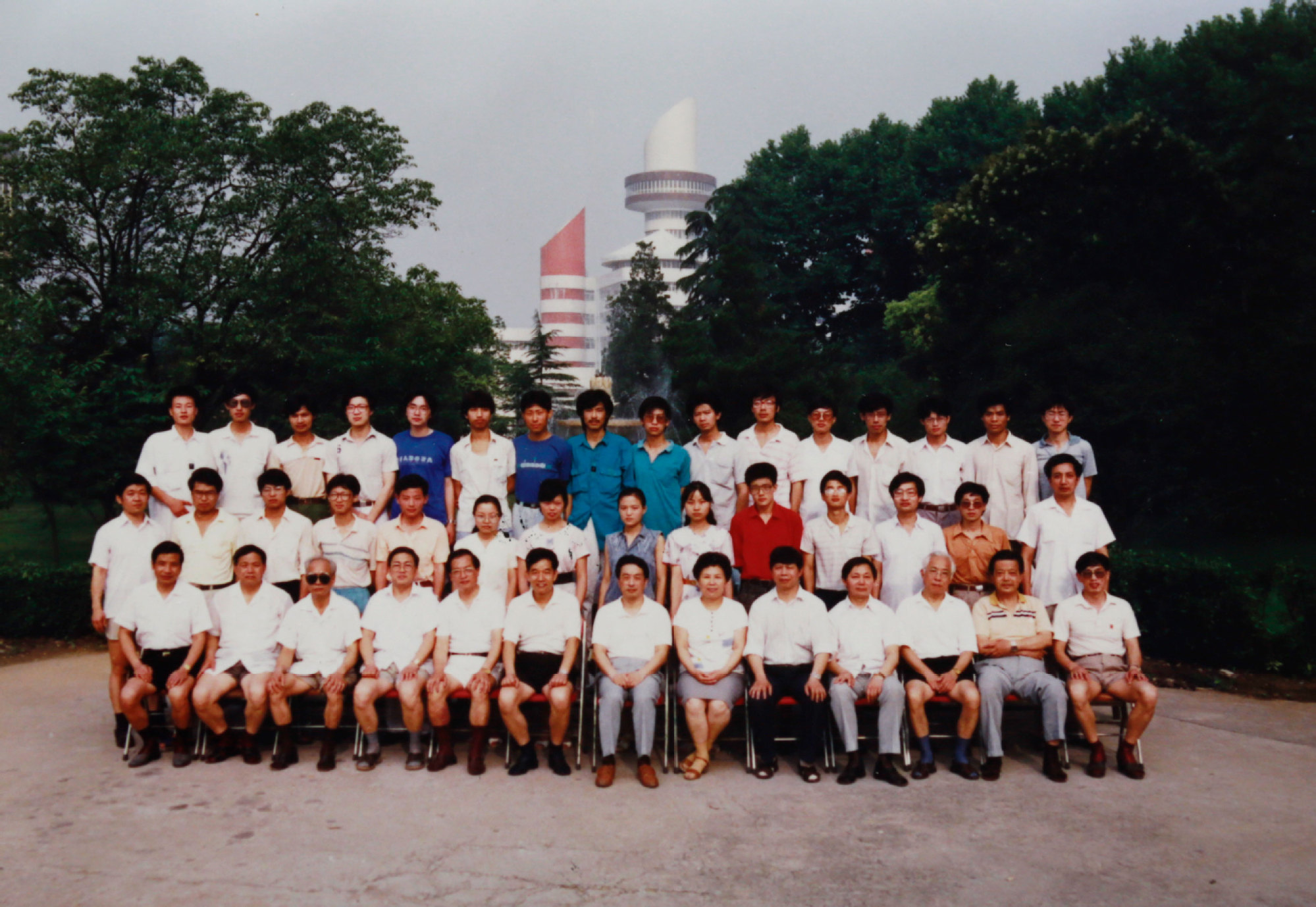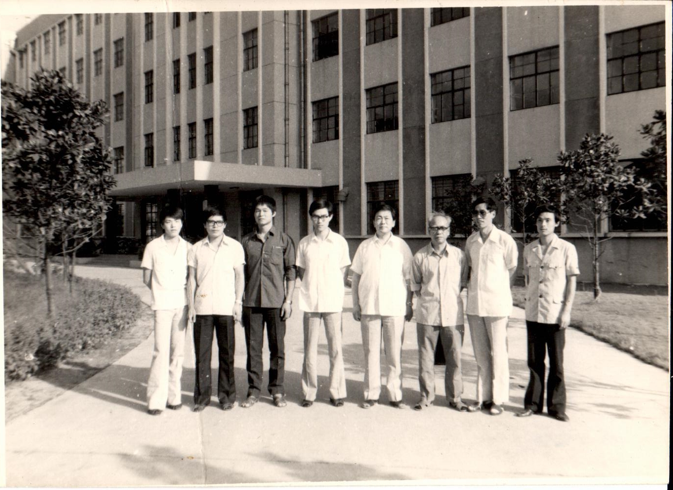 船舶制造工艺教研室在船舶工程系办公楼前合影(1987年)从左到右:窦培林、王自力、朱骏、张树锋、姚震华、范邦兴、胡毛字、蒋志勇