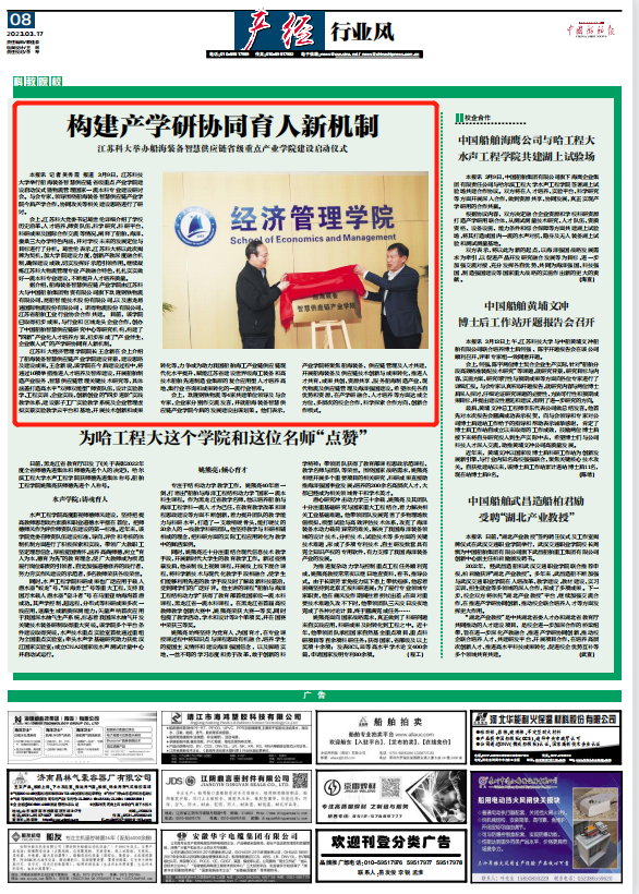 据介绍,船海装备智慧供应链产业学院由江苏科大与中国船舶集团物资有限公司旗下玖隆钢铁物流有限公司、昆船智能技术股份有限公司,以及惠龙易通国际物流股份有限公司、诺得物流股份有限公司、江苏省船舶工业行业协会合作共建。 目前,该学院已取得初步成果,与行业和区域龙头企业合作,创办了中国船舶智慧供应链研究中心等研究机构,构建了“四新”产业化人才培养方案,初步形成了“产业伴生、企业嵌入式”的产学研协同育人新机制。