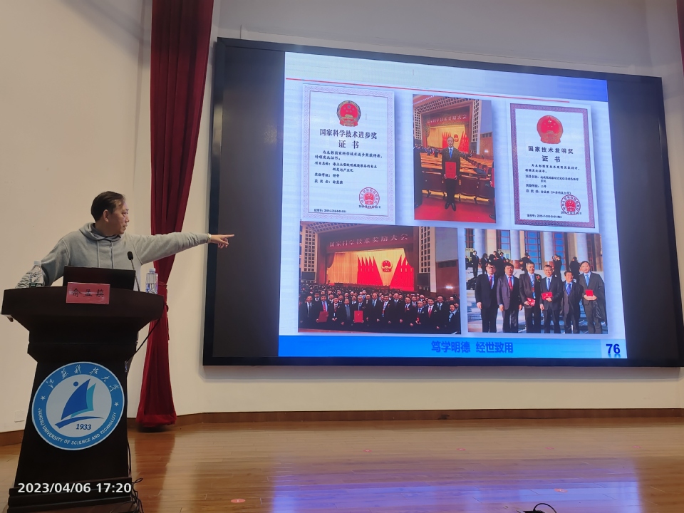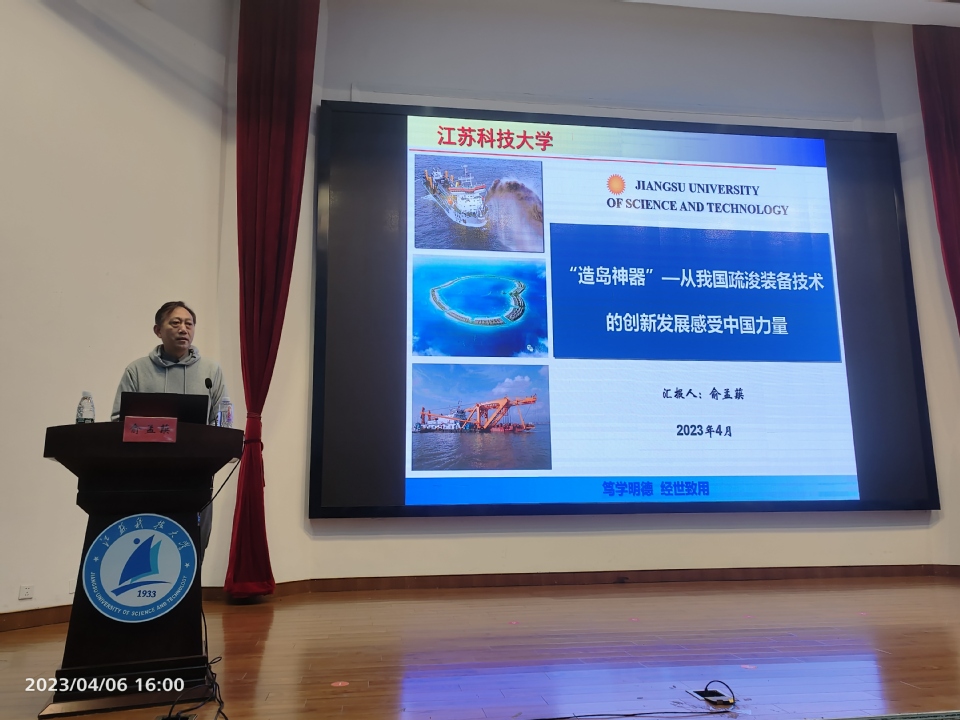 俞孟蕻教授在讲课中对我国的疏浚事业从最初的遭受国外封锁和垄断,核心技术受制于人,只能“买洋船搞疏浚”,到上世纪90年代,中国开始自主建造500方-1500方挖泥船,到2002年,中国大型挖泥船进入快速发展期,开启了大型挖泥船数字化信息化时代,再到现在,拥有世界最大的疏浚船队,耙吸船总舱容量和绞吸船总装机功率均排名世界第一这一从“引进”到“借鉴”再到“自主创新”的发展史给同学们作了详细介绍。通过对我国疏浚行业信息化、智能化的发展介绍,俞教授又从宏观层面详解了挖泥船的控制系统这一技术核心,通过实际应用中的动画和丰富的图文资料向大家展示了“造岛神器”神在哪里,带领大家领略了高科技的惊人力量。俞教授通过引用习近平总书记多次对海洋事业和海洋强国的重要论述指出,中国疏浚事业的发展和不断壮大,是一代代科研工作者埋头苦干、反复攻关、不断创新的真实写照,是中国几代船海人艰苦奋斗、努力拼搏谱写出的辉煌篇章。以俞教授为代表的江科大人在其中做出了努力、贡献了智慧,体现出江科大人在船舶海工领域“吃得了苦、扎得下根、聚得齐心、干得成事”的特质。