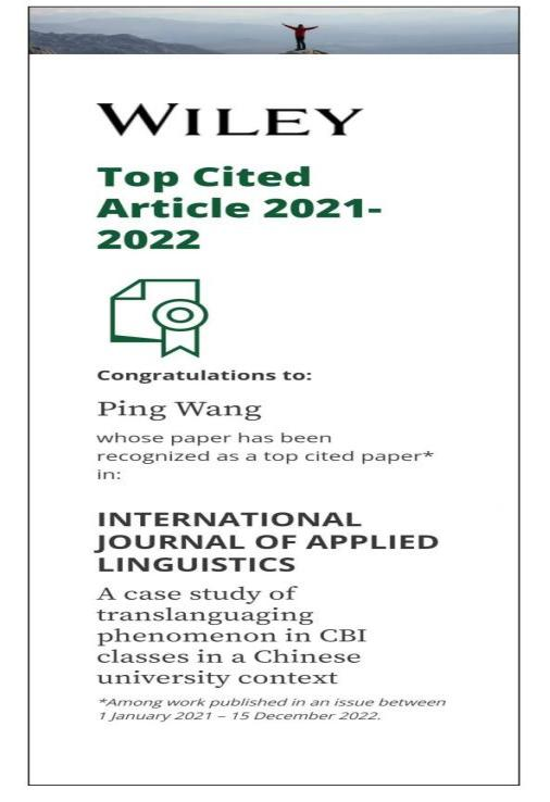 王平教授在超语(translanguaging)研究领域硕果累累。发表在国际SSCI和A&HCI双检索期刊International Journal of Applied Linguistics的超语研究论文“A case study of translanguaging phenomenon in CBI classes in a Chinese university context”被世界一流出版商WILEY评为2021-2022最高被引论文,荣获“WILEY Top Cited Article 2021-2022证书。