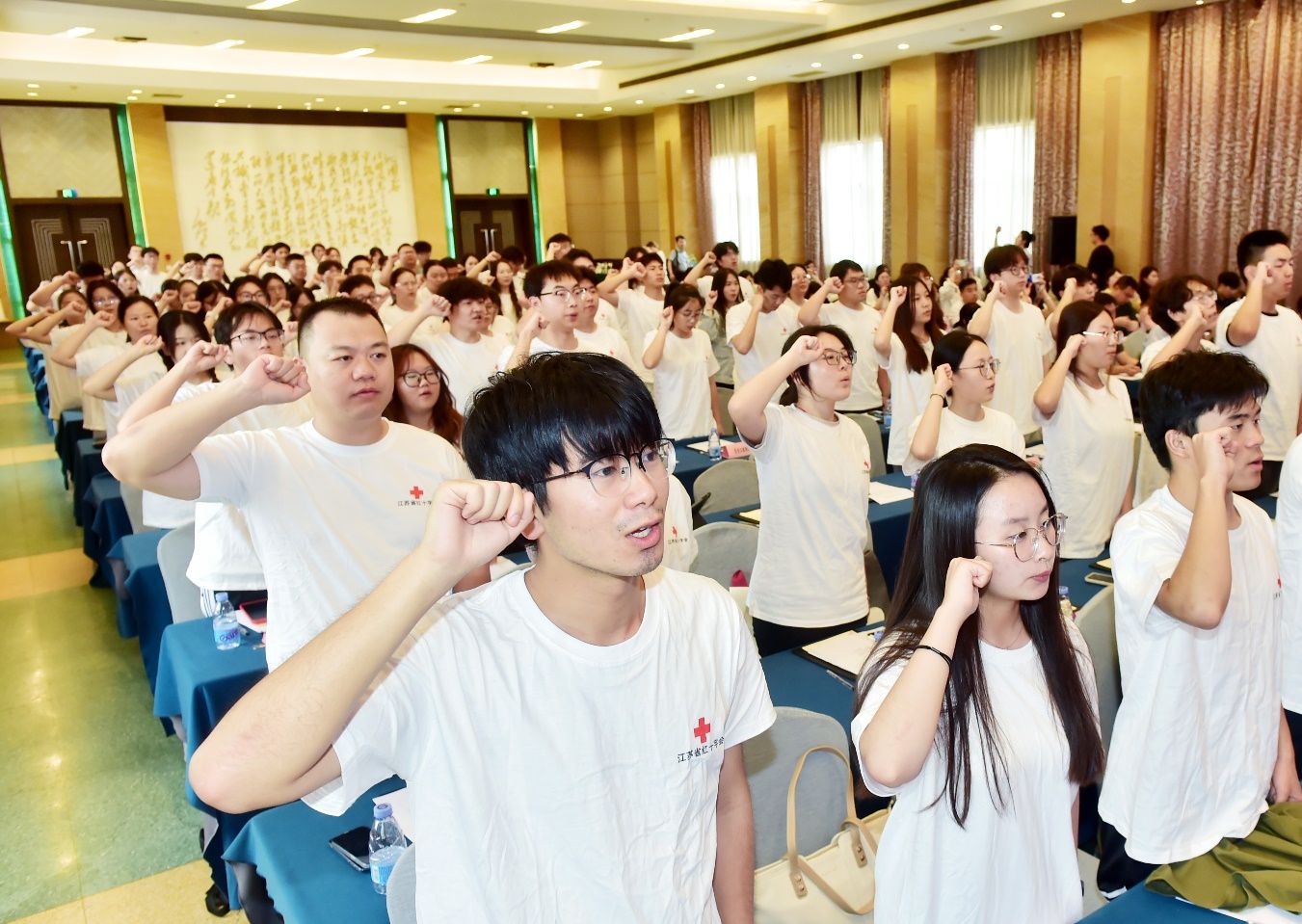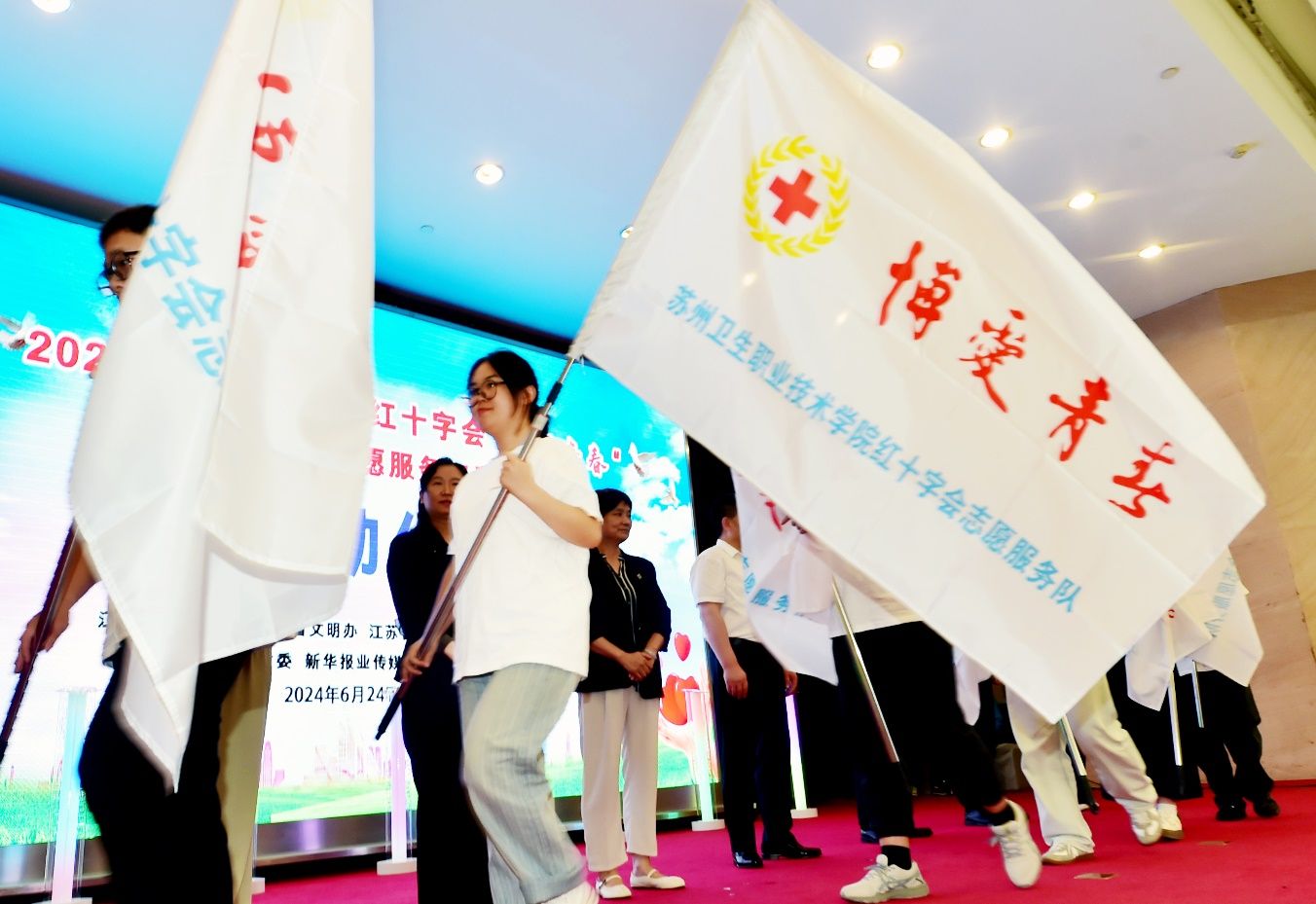 6月24日下午,2024年全省高校红十字会“博爱青春”暑期志愿服务项目启动仪式在南京举行,60个高校项目负责人接过队旗,正式拉开高校红十字志愿者深入乡村社区、学校医院和厂矿企业开展人道领域志愿服务的序幕。