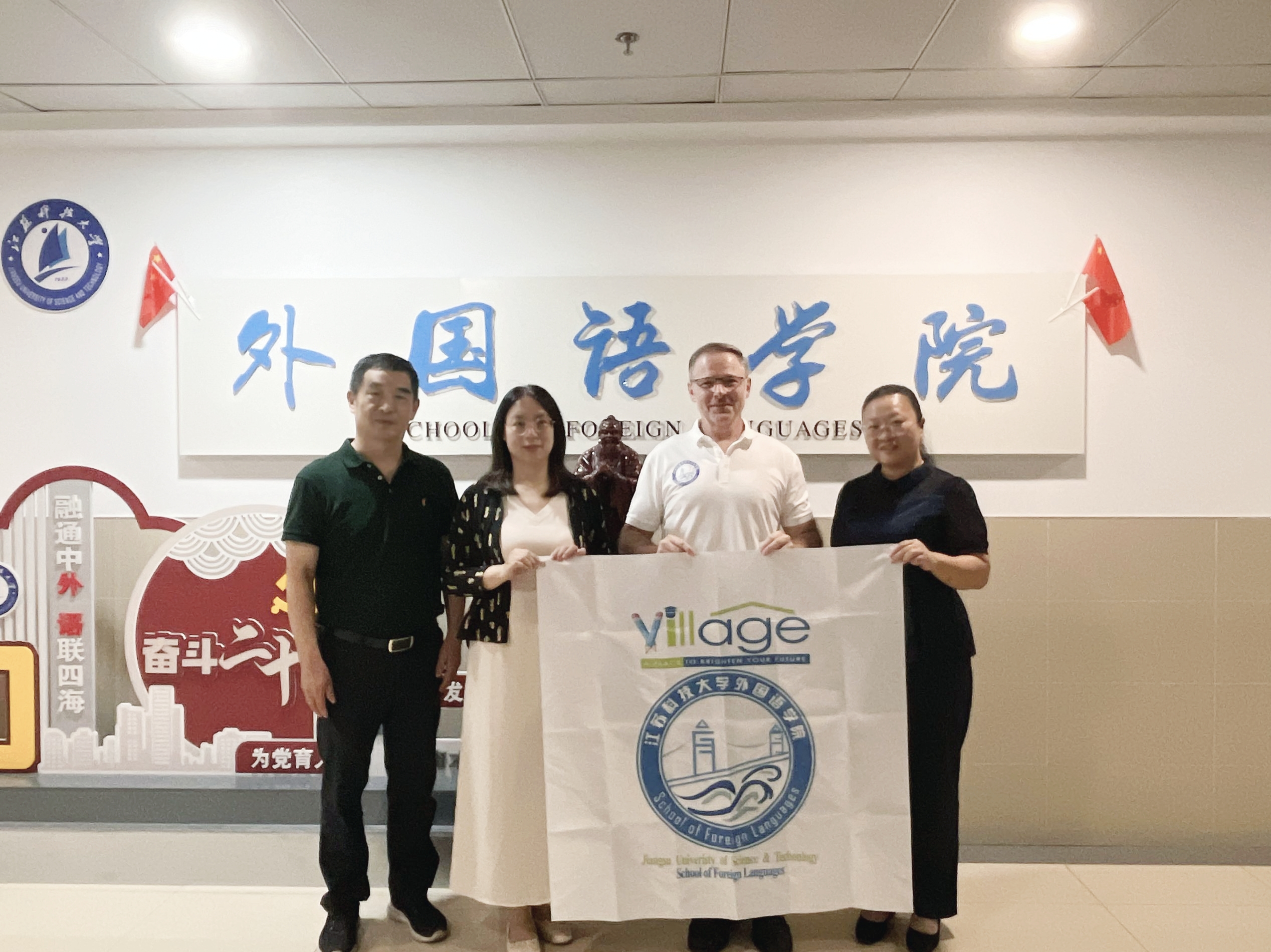 本次支教出发前,外国语学院院长曾景婷为Mark老师举行了简短的欢送仪式,授予Mark老师外国语学院与The Village of English 的合作共建标志旗,并为孩子们准备常用的文具,让他们感受到了来自中国的关怀与温暖。