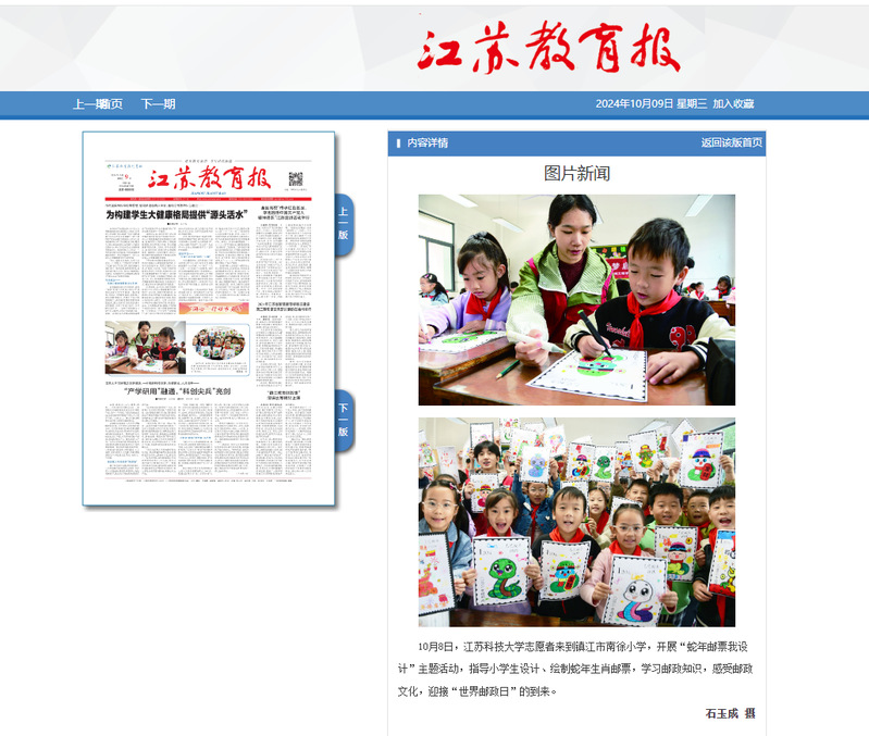10月8日,安博网页版登录入口志愿者来到镇江市南徐小学,开展“蛇年邮票我设计”主题活动,指导小学生设计、绘制蛇年生肖邮票,学习邮政知识,感受邮政文化,迎接“世界邮政日”的到来。
