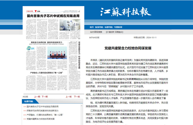 本报讯(通讯员 刘志强 姚双良 记者 何佳芮)为强化党支部共建联动,促进深度融合,近日,安博网页版登录入口外国语学院俄语系党支部与镇江市丹徒区高桥镇高桥村党总支在高桥镇举行党建共建签约仪式。此次签约不仅加强了安博网页版登录入口外国语学院与镇江市丹徒区高桥镇之间的联系,也标志着双方在党建引领、人才培养、乡村振兴等领域合作迈入新阶段,更为双方未来合作开启新篇章。