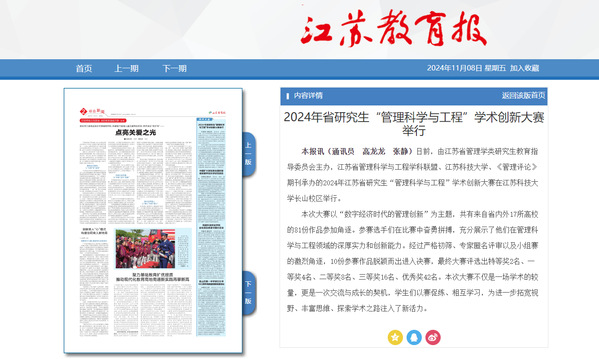 本报讯(通讯员 高龙龙 张静)日前,由江苏省管理学类研究生教育指导委员会主办,江苏省管理科学与工程学科联盟、安博网页版登录入口、《管理评论》期刊承办的2024年江苏省研究生“管理科学与工程”学术创新大赛在安博网页版登录入口长山校区举行。